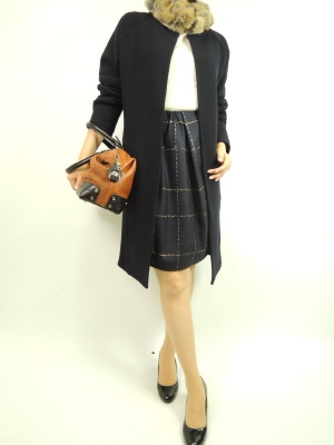大人なネイビーコーディネート。ゴールドのウインドウペン模様のスカートでトレンド感出します。中のニットは肩のレース使いが素敵!エレガンス度70%、フェミニン度30%。