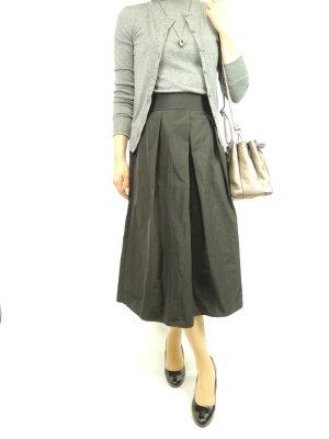 ミモレ丈のナイロンタフタの黒のスカートが一枚あるとコーディネートが旬になりますよ。シンプルなトップスでさらりと着こなして!スタイリッシュ度70%、エレガンス度30%。