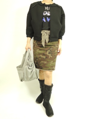 流行のボンディングジャケット&迷彩柄スカートで流行を先取り!スタイリッシュ度60%、アクティブ度40%。