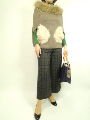 チェックのワイドパンツはファー付きポンチョと合わせて秋らしいファッションコーディネートに!アクティブ度70%、フェミニン度30%。