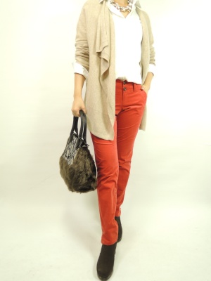 白シャツとコーディロイパンツにカシミヤ100%のカーディガンでクラス感のあるカジュアルスタイルに。カラーパンツで季節の色を取り入れました!スタイリッシュ度70%、アクティブ度30%。