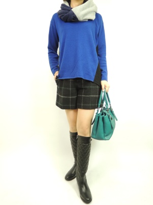 ショートパンツもちえっくがらが新鮮ですね。色のトーンをまとめて秋のお出かけを楽しんで!フェミニン度70%、アクティブ度30%。