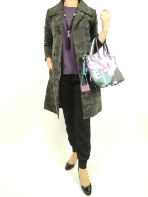 トレンドの迷彩柄のコート。カットソー生地なので動きやすく、着やすい一着。リブ裾パンツで今年モードに!スタイリッシュ度90%、エレガンス度10%。