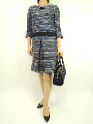 ネイビーのツイードで上品さをUP。アクセとバッグにネイビーをリンクして大人の上品コーデに!エレガンス度80%、スタイリッシュ度20%。