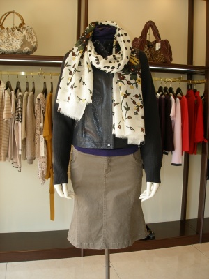 ハ−ドな皮革のブルゾンをベーシックなスカートで合わせて女らしく!ブルゾンの袖は外せます。スタイリッシュ度90%、フェミニン度10%。