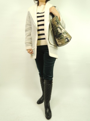 モコモコフェイクムートンコートをざっくり着こなして。ブーツインした別珍パンツも新色なグリーン系が新鮮!アクティブ度70%、フェミニン度30%。