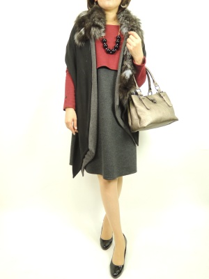 ボルドーとグレーのバイカラーワンピースをファーであしらったストールで華やかに仕上げました。シックでゴージャスなスタイリング!エレガンス度80%、スタイリッシュ度20%。
