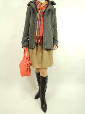 グレートキャメルの色の中に赤系の柄でメリハリをつけて。顔まわりを明るく見せると華やかさが加わる!フェミニン度80%、アクティブ度20%。