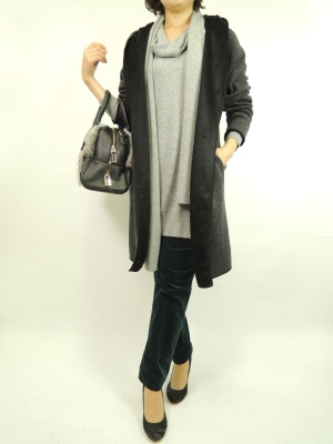 ニットのワンピースにロングの着流しカーデで無造作に着こなしてこなれ感を出す!スタイリッシュ度80%、アクティブ度20%。