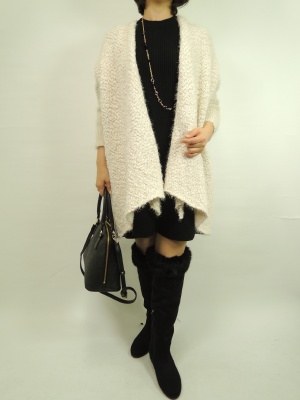Aラインのワンピース。羽織ったニットカーデをオフホワイトにして明暗のあるコーディネートに!エレガンス度80%、スタイリッシュ度20%。