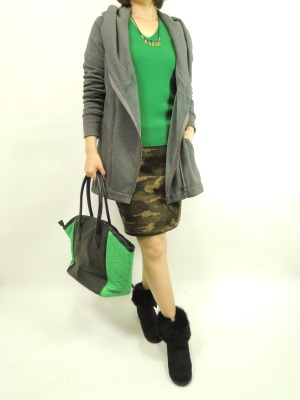 ショートブーツにはタイトなカジュアルスカートが良く似合う。全体にダーク系の色に綺麗なグリーンで差し色に!アクティブ度70%、フェミニン度30%。