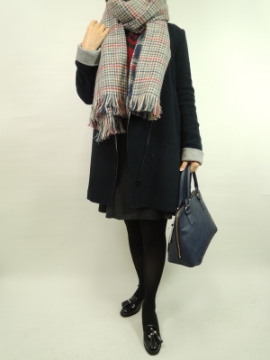 ダブルフェイスのコートにグレー×赤の組み合わせを入れる。ストールに色をリンクして色で遊ぶコーディネート!フェミニン度70%、スタイリッシュ度30%。