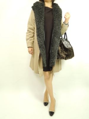 ダークな色のサックスワンピース。ネックラインのビジューが印象的。衿のボリュームがオシャレなコートでメリハリを!エレガンス度70%、スタイリッシュ度30%。