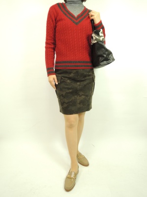 チルデンセーターと迷彩スカートのコーディネートは秋冬のカジュアルスタイルにピッタリ!アクティブ度70%、フェミニン度30%。