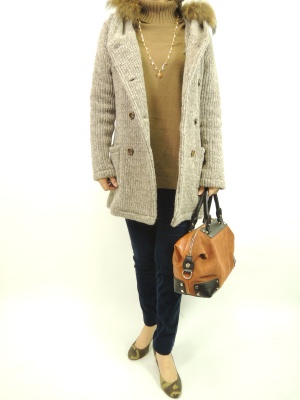 別珍のスリムなパンツにはお尻が隠れる丈のニットがバランスが取れてお洒落。ヒールを合わせることでカジュアル感を消した大人のコーディネート!スタイリッシュ度90%、フェミニン度10%。