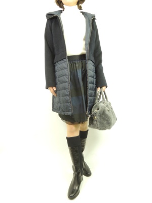 スカートはチュールとのリバーシブルです。シンプルなニットと組み合わせて。コートはワンピース風のお洒落なデザイン、閉じて着用してもOK!エレガンス度90%、フェミニン度10%。