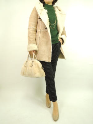 お袖の形に注目して頂きたいニットとピンストライプのパンツで旬なスタイルに!ムートンのコートがクラスカジュアル感をUP!スタイリッシュ度80%、フェミニン度20%。