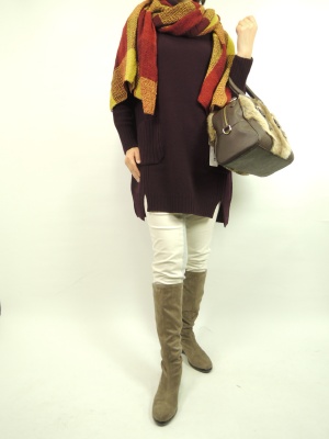 秋冬のパープルコーデは暖かみと女らしさを感じさせ、色のこーティネートを楽しみたい。ストール使いでシンプルなワンピーでデイリーも華やかに!アクティブ度70%、スタイリッシュ度30%。