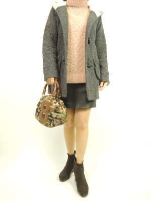 腰が隠れるざっくりニットにはレザースカートが良く似合う。ニットのダッフルコートでカジュアルに!フェミニン度60%、アクティブ度40%。