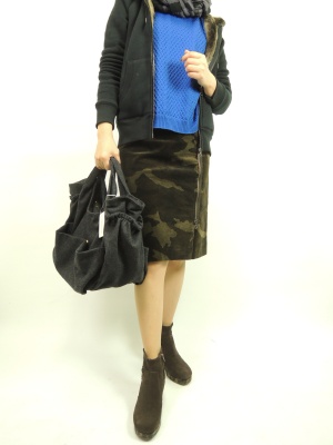 迷彩柄のスカートは明るめ色でまとめるとオシャレ度がアップします。黒のパーカは衿のボアが可愛いですね!アクティブ度80%、フェミニン度20%。