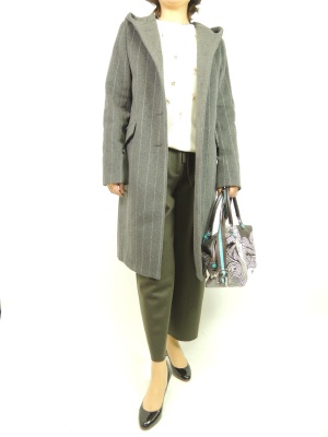 フードつきチェスターコート。トレンド感漂う一着。ボトムスも流行の太目タイプをチョイスしてモードさを強調!スタイリッシュ度100%。