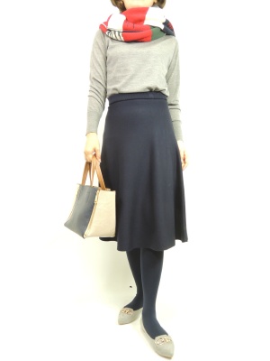 ニットのミモレ丈スカート。タートルニットの組み合わせは羽織りや小物でいろいろなコーディネートを楽しめます。ストールを加えるだけでも綺麗にきまる!フェミニン度80%、スタイリッシュ度20%。