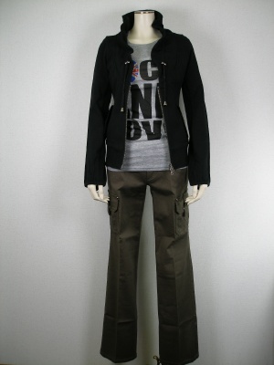 ジャージ素材の短丈ブルゾンは、パンツによく合います。少しカジュアルなロゴTを組み合わせて・・。カーゴパンツはロールアップして男前にしてもOK!スタイリッシュ度80%、アクティブ度20%。