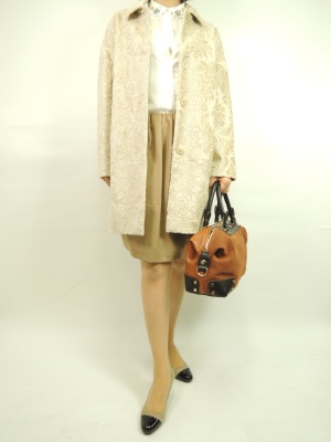 優しげなエレガントを感じさせる(エクリューカラーの)コーディネート。コートはゴブラン織りで、さりげなく華やかでブラウスのビジューは優しく数色のビーズの組み合わせで奥行のある美しさがあります!エレガンス度90%、フェミニン度10%。