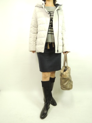 白×ネイビーのミドル丈のダウンは冬のカジュアルをクラスアップしてくれます。キュートなボーダーニットとスカートを組み合わせて気分もUP!アクティブ度60%、フェミニン度40%。