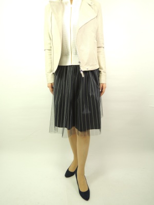 ボリュームのあるチュールスカートは皮革のブルゾンで甘辛ファッションにまとめるとお洒落!スタイリッシュ度70%、フェミニン度30%。
