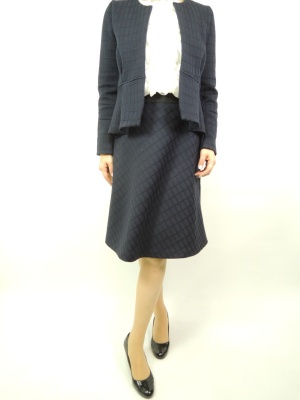 ノーカラージャケットとフレアースカートのセットアップは白のフリルのカットソーで合わせれば入学、卒業のシーズンにも対応できるタイプです!エレガンス度70%、フェミニン度30%。
