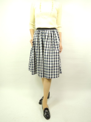 大きなギンガムチェックのギャザースカートと綺麗な黄色のニットをプラス。レトロ感漂う組み合わせがお洒落!フェミニン度70%、スタイリッシュ度30%。