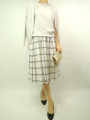 ミモレ丈のスカートにベーシックなツインニットを組み合わせるだけで地味色も素材の良いもので、こんなにエレガントになる!エレガンス度90%、スタイリッシュ度10%。