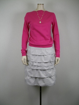 普通のシンプルなニットカーディを前後 逆に着てみました。後ろボタンが可愛くポイントになりますね!フェミニン度100%。