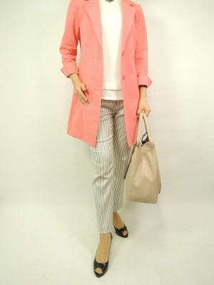 ベーシックなコートも鮮やかなカラーで春らしく。ピンストライプのパンツと合わせてスタイリッシュに着こなしたい!スタイリッシュ度70%、エレガンス度30%。