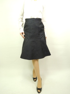 フリルブラウスの白とネイビーのスカートでエレガントに。ジャガード織りが高級感をプラスしてくれる!エレガンス度90%、フェミニン度10%。
