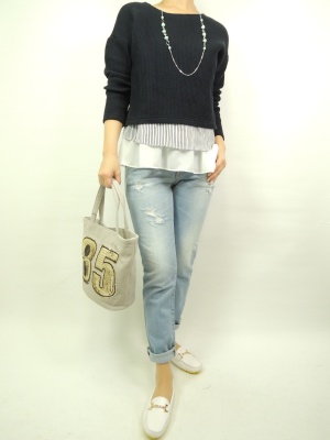 デニムファッションは気負いなくスマートに見えるコーデが良い。重ね着になっているトップスにさらっとコーディネート!アクティブ度90%、スタイリッシュ度10%。