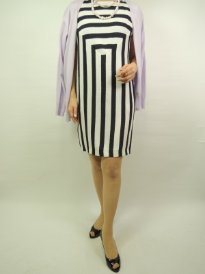 ストライプのワンピースは白×紺のメリハリの付いたモード感漂う一枚。色合わせは淡い紫で春らしく装いたい!エレガンス度70%、スタイリッシュ度30%。