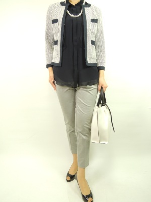 センターラインパンツは柔らかいシルエットを合わせて上品にかつ女っぽくて・・。ノーカラーJKで引き締めて!スタイリッシュ度70%、エレガンス度30%。