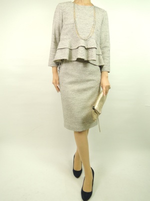 ツイード生地のタイトなシルエット。トップスはぺプラムで広がりが出る分スカートはタイトでスッキリ!エレガンス度80%、スタイリッシュ度20%。