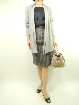 着流しカーデはタイトスカートが良くマッチします。グレー系でまとめてシックな装いに着こなす!スタイリッシュ度70%、エレガンス度30%。