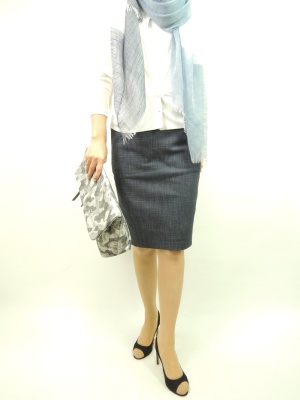 | 紺×白のスクールガールスタイルも、上品なデニムのタイトスカートで合わせれば大人っぽいスタイルが完成!スタイリッシュ度70%、エレガンス度30%。 |