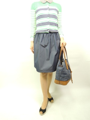 カーデ+スカートにアクセントで付け衿。それもパール系のお洒落なアイテムをプラスしてフェミニンに装いました。スカートはリバーシブルの裏側を使用!フェミニン度70%、エレガンス度30%。