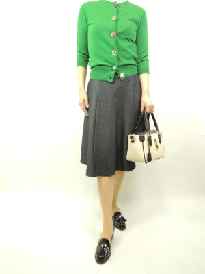 ビジューの付け衿でいつものカーデをお洒落に生れ変わらせて。グリーンの中に白のアクセントは顔の周りが明るくなりますね!フェミニン度90%、エレガンス度10%。