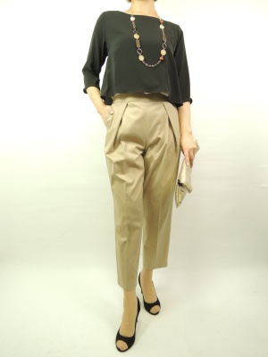 ブラウスの下の部分をインするとゆるパンツもウエストがメリハリがついてスタイルよく見える。決め手はハイヒールでバランスを取って!スタイリッシュ度80%、エレガンス度20%。