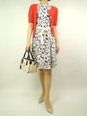 花柄はそれだけでフェミニンですね。白のリボンと裾から見える白の別布がよりフェミニン度をUP。赤のカーデでメリハリを!フェミニン度90%、エレガンス度10%。