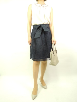 オーガンジーのリボンスカートに柔らかなブラウスで清楚に4月学校行事にもひけをとらないコーディネート!エレガンス度90%、フェミニン度10%。