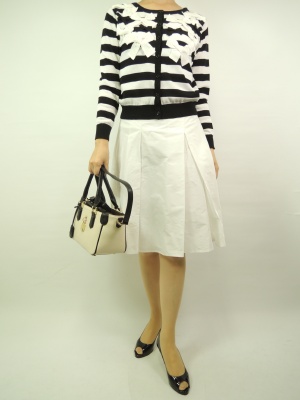 白のスカートにボーダーカーデ。よく見るとボーダーにいっぱいのリボン、白×黒のモノトーンなのでフェミニンになり過ぎないコーディネート!フェミニン度80%、エレガンス度20%。