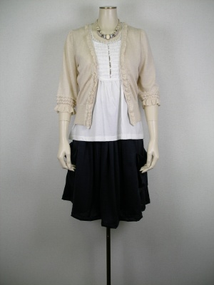 カットソー仕立てのスカートは左右のポケットが可愛いですね。ボレロ風のニットはコットン麻のナチュラル系。ふんわり軽やかな春のコーディネート!フェミニン度100%。