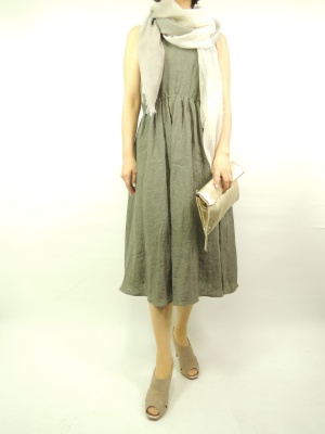 カーキのロング丈ワンピースは麻100%の夏素材。背中が開いたデザインで女らしい!エレガンス度80%、スタイリッシュ度20%。